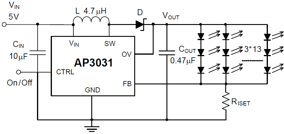 The AP3031 is an inductor-based DC/DC boost converter designed to drive LED arrays. 1.4A switching current allows AP3031 to be used in different 7' to 10' LCD panel backlights (3*13 LED arrays typically). A constant frequency 1MHz PWM control scheme is employed in this IC, which means tiny external components can be used. Specifically, 1mm tall 4.7μH inductor and 0.47μF output capacitor for the typical application is sufficient.