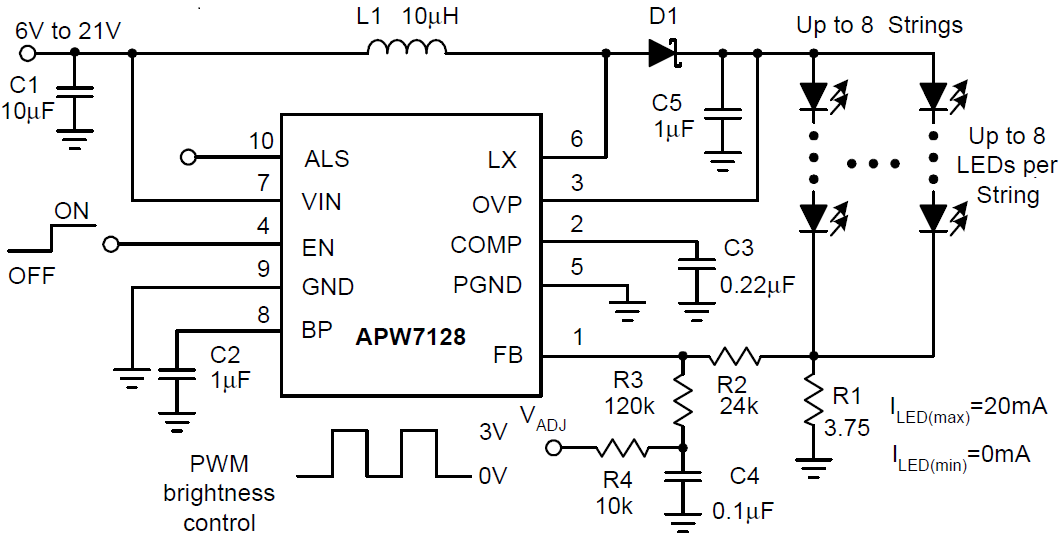 The APW7128 is the high power and high efficiency boost converter with an integrated 30V FET ideal for LCD panel backlighting applications. 30V output voltage allows for 8 high-power LEDs in series, and 3.5A inductor current limit allows for more LED strings connected in parallel. The low 0.5V feedback voltage offers higher efficiency in WLED driver applications. The wide input range from 2.7V to 21V made APW7128 a perfect solution for various applications such as LCD monitor and portable devices. The OVP pin monitors the output voltage to protect IC during open load and FB pin short circuit operations. The APW7128 provides the ALS pin to simplify the interface to an ambient light sensor for automatic dimming. The APW7128 is available in the thermally enhanced DFN-10 lead 3mmx3mm package.