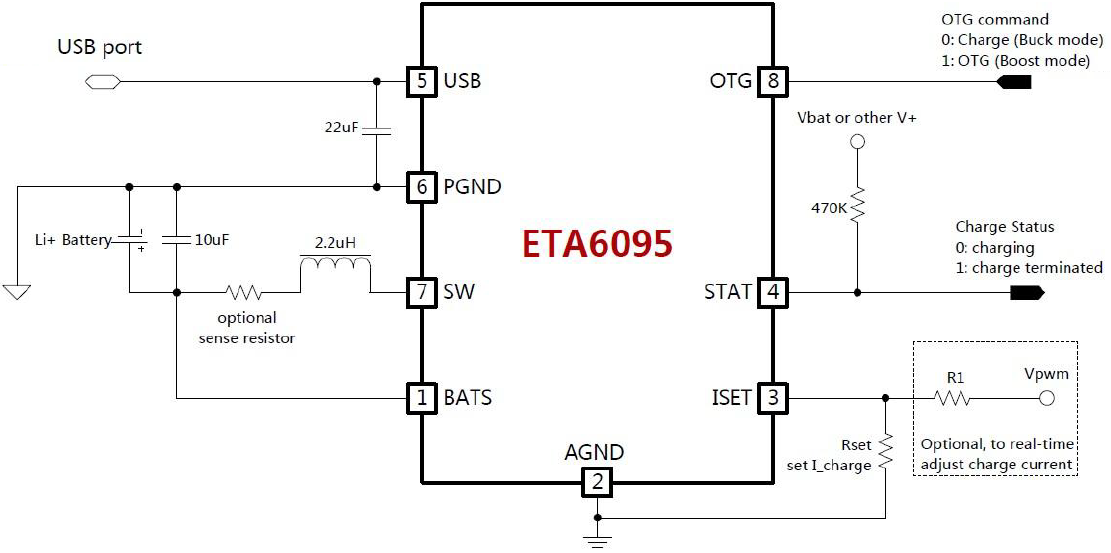 ETA6095是一个开关型锂离子电池充电器,能够高效率的提供高达2A的电池端充电电流以及1.5A的升压OTG输出能力。在充电时,它使用一个专利的控制架构,来省略了外部电流取样电阻器,最大化提升了效率,减少了充电时间和整机成本。它同样可以反向的从电池端获取能量,在USB引脚输出一个5V的电压。ETA6095是一个理想的电池充电器和升压应用的理想解决方案,特别适用于那些利用一个USB来实现充电和放电输出的应用,例如移动电源,智能手机,和平板应用等。