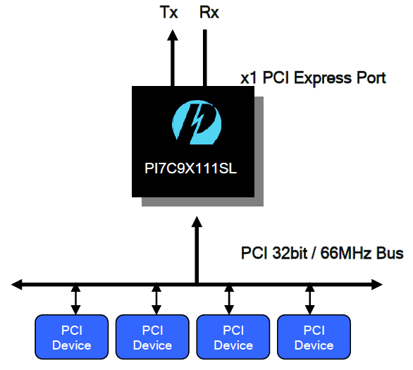 PI7C9X111SL is a PCIe-to-PCI/PCI-X bridge. PI7C9X111SL is compliant with the PCI Express Base Specification, Revision 1.1, the PCI Express Card Electromechanical Specification, Revision 1.1, the PCI Local Bus Specification, Revision 3.0 and PCI Express to PCI/PCI-X Bridge Specification, Revision 1.0. PI7C9X111SL supports transparent mode operation. Also, PI7C9X111SL supports forward and reverse bridging. In forward bridge mode, PI7C9X111SL has an x1 PCI Express upstream port and a 32-bit PCI downstream port. The 32-bit PCI downstream port is 66MHz capable (see figure 1-1). In reverse bridge mode, PI7C9X111SL has a 32-bit PCI upstream port and an x1 PCI Express downstream port. PI7C9X111SL configuration registers are backward compatible with existing PCI bridge software and firmware. No modification of PCI bridge software and firmware is needed for the original operation.