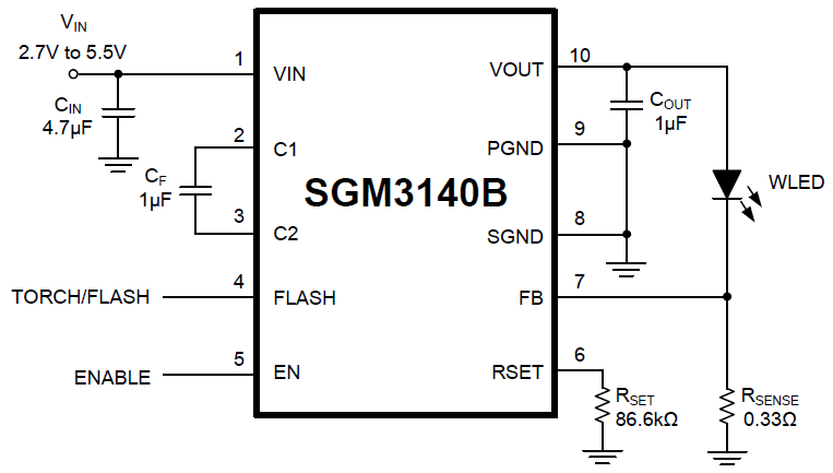 The SGM3140B is a current-regulated charge pump ideal for powering high brightness LEDs for camera flash applications. The charge pump can be set to regulate two current levels for Flash and Torch modes. The SGM3140B automatically switches modes between step-up and step-down ensuring that LED current does not depend on the forward voltage. It switches at 2.2MHz, allowing the use of tiny components. The supply voltage ranges from 2.7V to 5.5V and is ideally suited for all applications powered by a single Li-Ion battery cell or three to four NiCd, NiMH, or Alkaline battery cells.