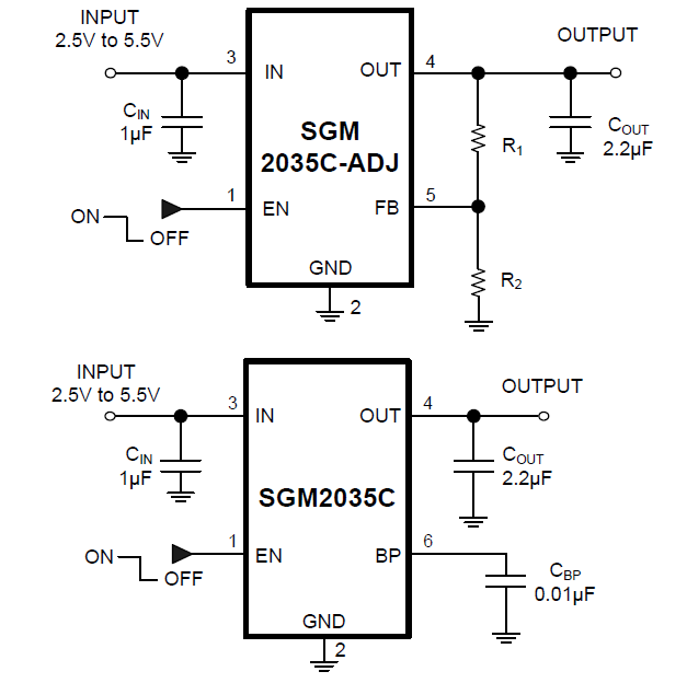 The SGM2035C is a low-power, low-noise, low-dropout, CMOS linear voltage regulator that operates from a 2.5V to 5.5V input voltage. The SGM2035C is the perfect choice for low voltage, low power applications. A low ground current makes this part attractive for battery operated power systems. The SGM2035C also offers ultra low dropout voltage to prolong battery life in portable electronics. Systems requiring a quiet voltage source, such as RF applications, will benefit from the SGM2035C’s ultra low output noise (30μVRMS) and high PSRR. An external noise bypass capacitor connected to the device’s BP pin can further reduce the noise level.