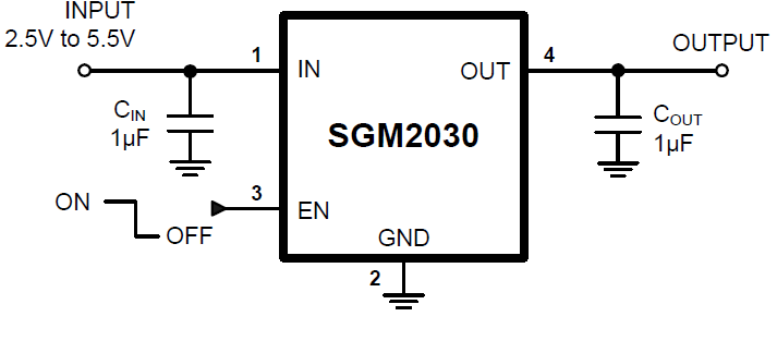The SGM2030 series low-power, low-dropout, CMOS linear voltage regulators operate from a 2.5V to 5.5V input voltage in an ultra small package. They are the perfect choice for low voltage, low power applications. A low ground current makes this part attractive for battery operated power systems. The SGM2030 series also offer ultra low dropout voltage to prolong battery life in portable electronics. Systems requiring a quiet voltage source, such as RF applications, will benefit from the SGM2030 series’ low output noise and high PSRR. Other features include a 10nA logic-controlled shutdown mode, foldback current limit and thermal shut-down protection.