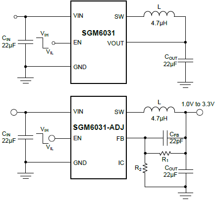 The SGM6031 family integrates an optimized hysteretic controller for low-power applications. The internal circuitry uses a time-based sampling system to reduce the average quiescent current.