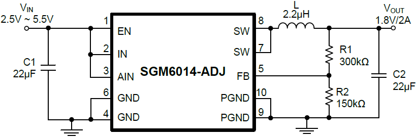 The SGM6014 also can run at 100% duty cycle for low dropout operation, extending battery life in portable systems while light load operation provides very low output ripple for noise sensitive applications. It can supply up to 2A output load current from a 2.5V to 5.5V input voltage and the output voltage can be regulated as low as 1.2V. The high switching frequency (1.4MHz) minimizes the size of external components while keeping switching losses low. The internal slope compensation setting allows the device to operate with smaller inductor values to optimize size and provide efficient operation.