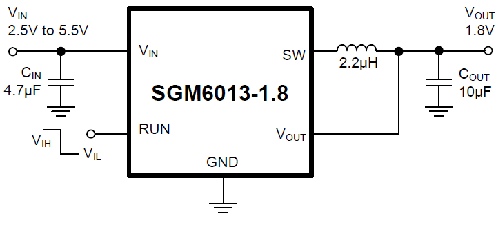 The SGM6013 is a 1.6MHz, constant frequency, current mode, synchronous, step-down switching regulator. It can deliver 800mA load current from 2.5V to 5.5V input voltage, and output voltage can be as low as 0.6V. High switching frequency minimizes the sizes of inductor and capacitor. Integrated power MOSFETs and internal compensation make the SGM6013 simple to use and fit the total solution in a compact space.