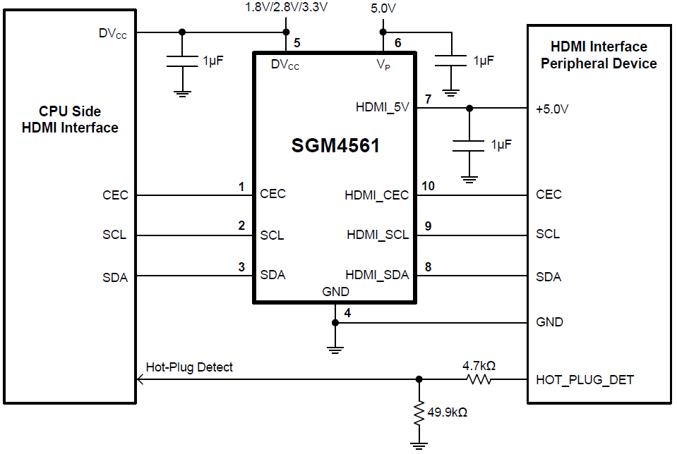 The SGM4561 provides the load switch and signal level shifting needed for HDMI interface. The part meets all type approval requirements of logical level shifting for HDMI interface and contains a 5.0V load switch to protect hot-insertion of HDMI interface. The load switch can support 200mA of load current.