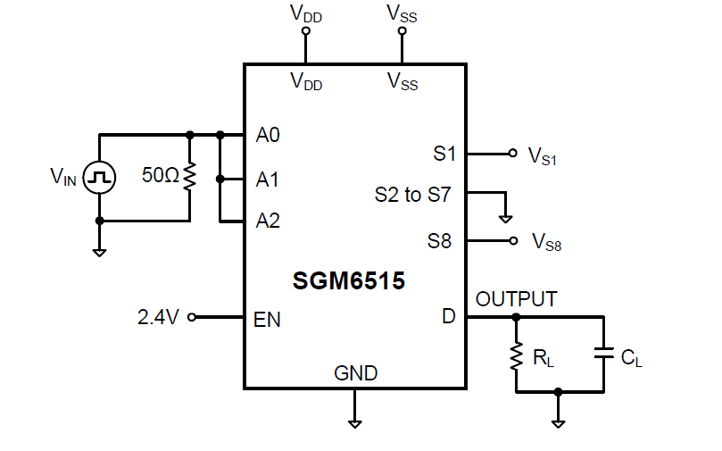 The SGM6515 is a high speed monolithic 8:1 analog signal multiplexer. The SGM6515 switches one of 8 inputs to a common output, as determined by the 3-bit binary address lines (A0, A1 and A2). An EN input enables or disables the device. When disabled, all channels switch off; when enabled, each channel conducts equally well in both directions and has an input signal range that extends to the supplies.
