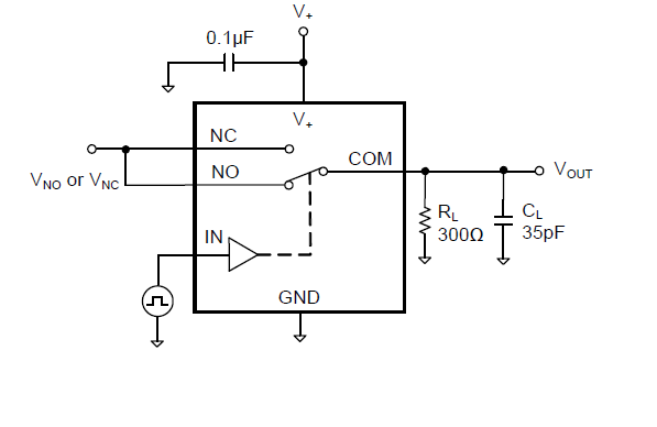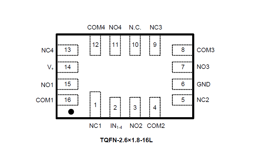 The SGM44602 consists of four SPDT switches. The configuration can be used as a bidirectional quad 2-channel multiplexer/demultiplexer with a single switchenable (IN1-4) input.