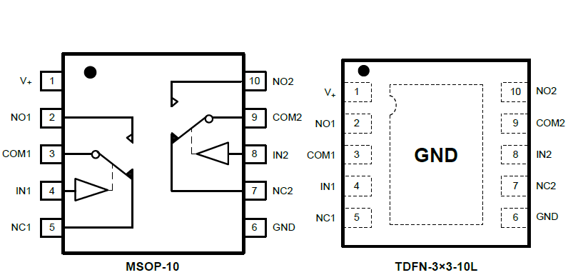The SGM3005 is a committed dual single-pole/ double-throw (SPDT) that consist of two normally open (NO) and two normally close (NC) switches. This configuration can be used as a dual 2-to-1 multiplexer.