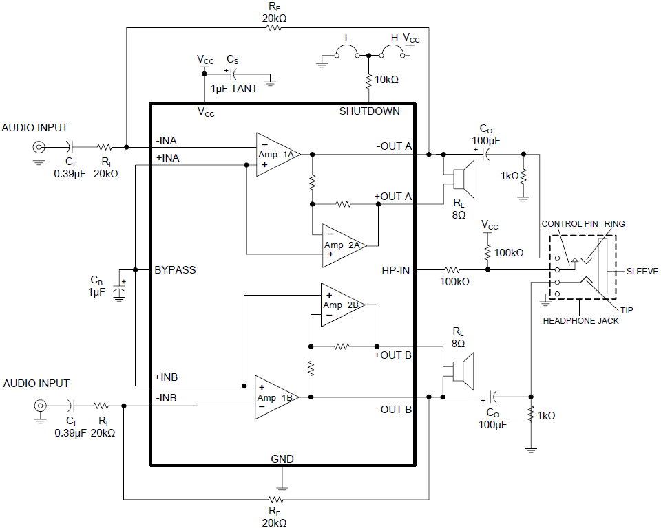 THD+N. In addition, the headphone input pin allows the amplifiers to operate in single-ended mode when driving stereo headphones.