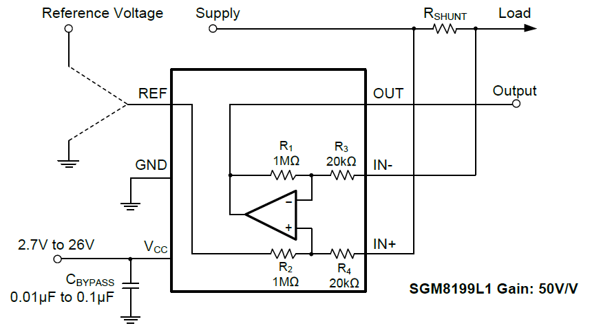 The SGM8199L is a voltage output current shunt monitor which can sense drop across shunt at common mode voltages from 0V to 26V, independent of the supply voltage. The gain of SGM8199L1 is 50V/V. The low offset enables current sensing with maximum drops across the shunt as low as 10mV full-scale.