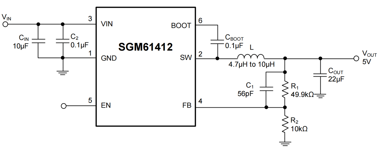 SGM61412 features high efficiency over a wide load range achieved by scaling down the switching frequency at light load condition to reduce switching and gate driving losses. Other features include internal compensation, internal monotonic soft-start even with pre-biased output and fast loop response due to the peak-current mode controller. Switching at 1.2MHz, the SGM61412 can prevent EMI noise problems, such as the ones found in AM radio, ADSL and PLC applications.