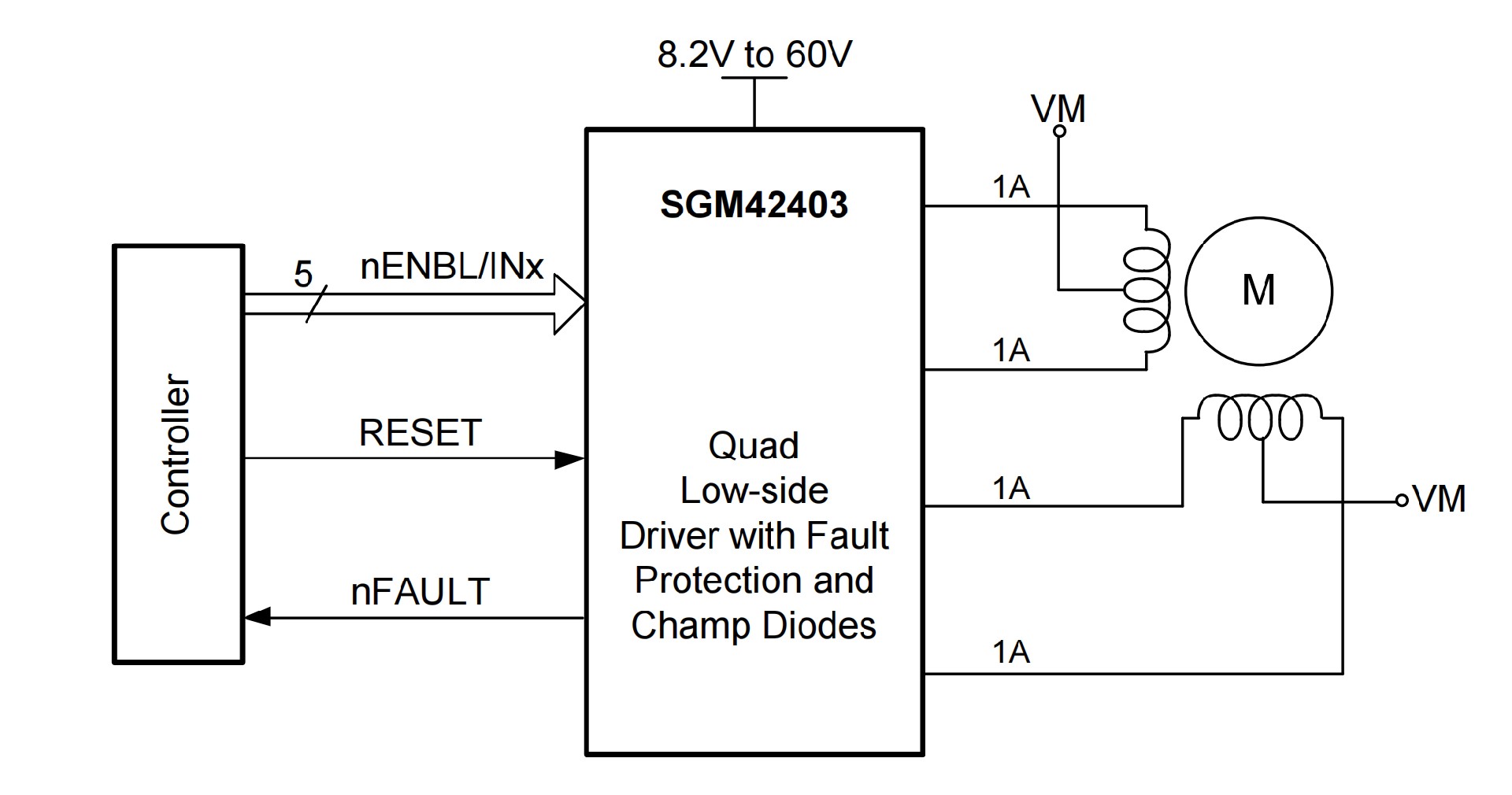 The SGM42403 consists of four identical low-side drivers with over-current protection. It has integrated diodes to clamp turn-off transients generated by inductive loads such as unipolar stepper motors, DC motors, relays, solenoids or other loads.