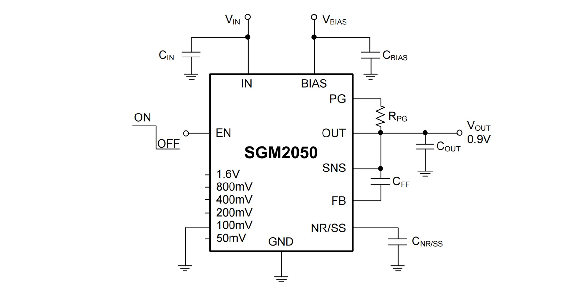 The SGM2050 is a high accuracy, low noise, very low dropout linear regulator. It is capable of supplying 3A output current with typical dropout voltage of only 99mV. The operating input voltage range is from 1.1V to 7V with BIAS and 1.4V to 7V without BIAS. The output voltage can be set from 0.8V to 3.95V in pin-selectable operation and adjusted from 0.8V to 5.2V by using an external resistor divider.
