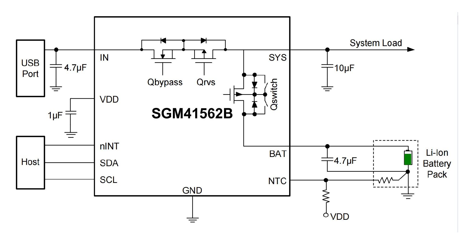 The SGM41562A/B has 3 power ports: input power port (IN), battery port (BAT) and system or load port (SYS). The system is powered from the input whenever it is available. Input is typically a USB power source. If the input source is weak or
