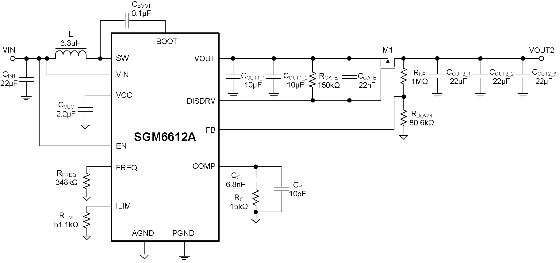 The SGM6612A provides a gate driver for external MOSFET to disconnect the output from input side during shutdown or output short condition. When the output is shorted and the short protection is triggered, the device enters into the hiccup mode for safety. In addition, the device also provides output over-voltage protection, inductor current limit protection and thermal shutdown protection
