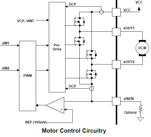 With proper PCB design, each H-bridge of the SGM42600 is capable of driving up to 1.5A RMS (or DC) continuously, at +25℃ with a VCC supply of 5V. It can support peak currents of up to 2A per H-bridge. Current capability is reduced slightly at lower VCC voltages.