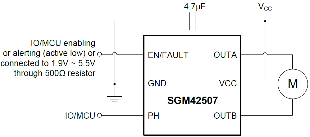 The SGM42507 is an H-bridge driver designed for actuating motors and coils bi-directionally turning. It translates logic level input to power driving outputs to motors or coils, for different spinning or moving directions by PH-EN/FAULT interface. Internal over- current (OC) and under-voltage (UV) protection circuits, together with over-temperature (OT) circuit prevent the device from being in over-stress condition, while an alert output simplifies stalling sensing, which is a useful feature for most applications.