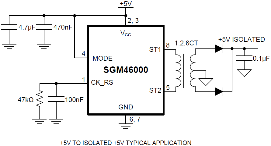 The SGM46000 is an integrated primary-side controller and H-bridge driver for isolated power-supply circuits. The device contains an on-board oscillator, protection circuitry and internal FET drivers to provide up to 3W of power to the primary winding of a transformer from +5V power supply. The SGM46000 can be operated using the internal programmable oscillator or can be driven by an external clock for improved EMI performance. Regardless of the clock source being used, an internal flip-flop stage guarantees a fixed 50% duty cycle to prevent DC current flow in the transformer.