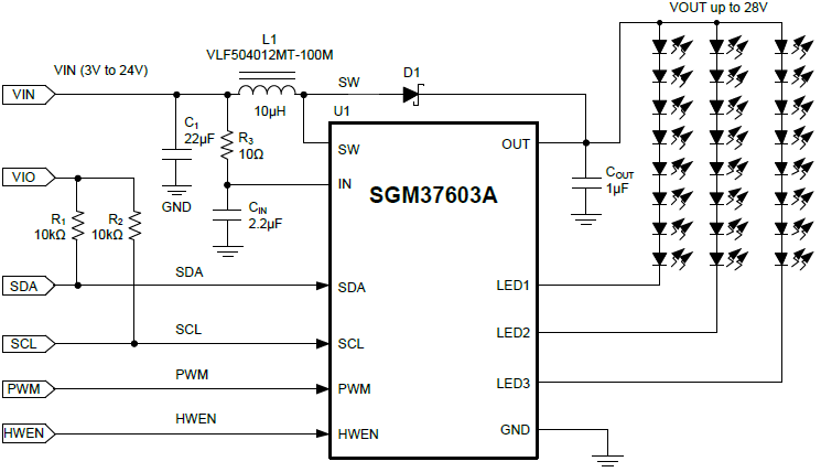 The LED current is adjusted via an I2C interface or through a logic level PWM input. The SGM37603A is available in Green WLCSP-1.78×1.36-12B and TDFN-3×3-12L packages. It operates over the -40℃ to +85℃ temperature range.