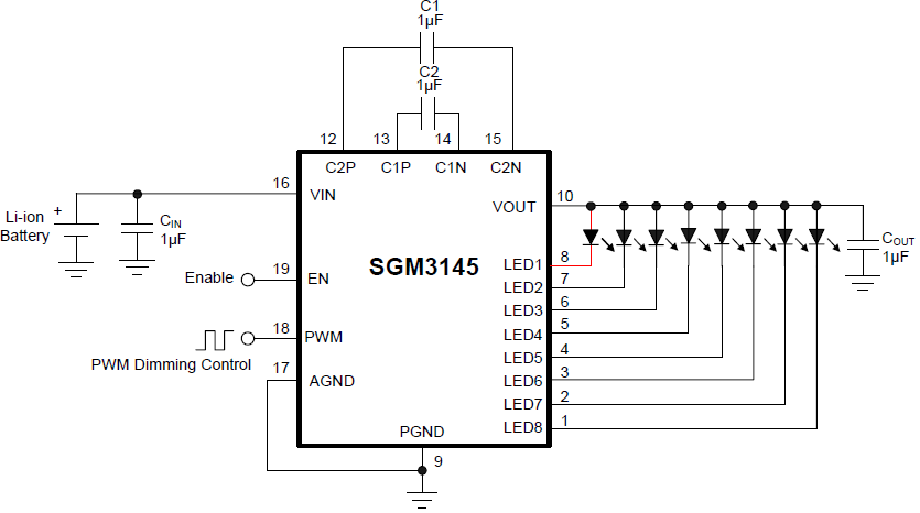 The SGM3145 supports up to 8 white LEDs and regulates a constant current which the initial value can be set by an internal resistor. The part implements PWM dimming to adjust the brightness of LED. Users can easily configure the LED current from 0mA to 27mA by a digital PWM signal. SGM3145 can be turned off by EN pin. The operating voltage range is 2.7V to 5.5V. Internal soft-start circuitry effectively reduces the in-rush current while both start-up and mode transition.