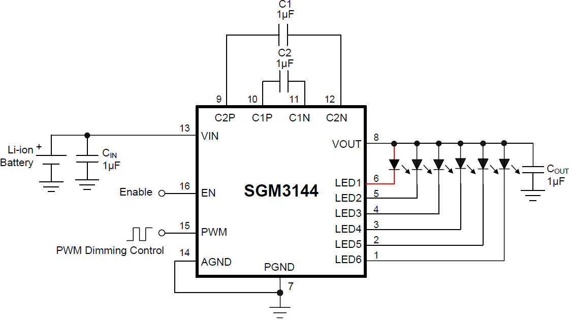 The SGM3144 supports up to 6 white LEDs and regulates a constant current which the initial value can be set by an internal resistor. The part implements PWM dimming to adjust the brightness of LED. Users can easily configure the LED current from 0mA to 27mA by a digital PWM signal. SGM3144 can be turned off by EN pin. The operating voltage range is 2.7V to 5.5V. Internal soft-start circuitry effectively reduces the in-rush current while both start-up and mode transition.