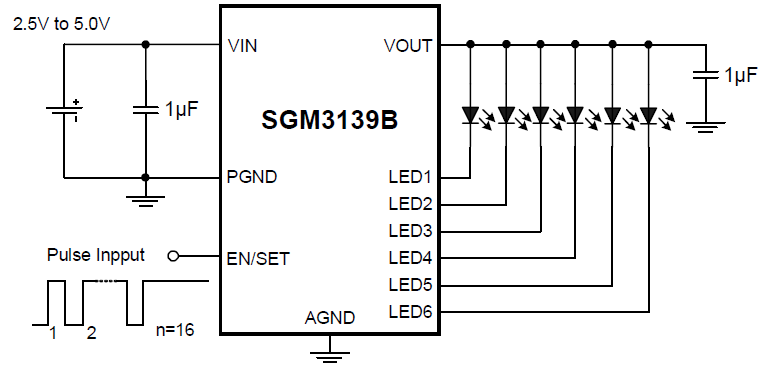 The SGM3139B is a 6-channel ultra low dropout constant source parallel LED driver. The SGM3139B uses an internal resistor to set the bias current for six LEDs, which are matched to ±3%. The SGM3139B incorporates a single wire interface to program the output current at 16 continuous steps. It has an internal deglitch circuit for filtering the noise of the EN input.