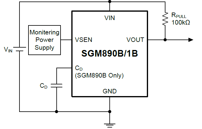 Moreover, SGM890B’s release delay time can be adjusted by the external capacitor which is connected to the CD pin. Consequently delay time can be set to more than 1s when the delay capacitor (CD) is 1μF. The VOUT pin is available in an N-channel open-drain output with active-low reset.