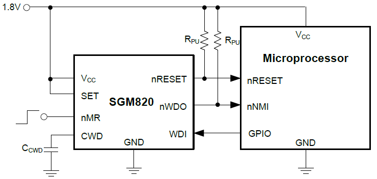 The SGM820 includes a programmable watchdog timer for a wide variety of applications. The dedicated watchdog output (nWDO) enables increased resolution to help determine the nature of fault conditions. The watchdog timeouts can be programmed either by an external capacitor, or by factory-programmed default delay settings. The watchdog can be disabled via logic pins to avoid undesired watchdog timeouts during the development process.