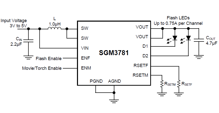 The two LED output sinks can be shorted together externally for higher power single flash LEDs, up to 1.5A continuous LED current. Thermal regulation is integrated in Flash mode to limit the IC’s temperature and continuously provide the maximum allowed output current. Various protection features are built into the SGM3781, including cycle-by-cycle input current limit protection, output over-voltage protection, LED fault (open or short) protection and thermal shutdown protection. The leakage current in shutdown is less than 1μA.